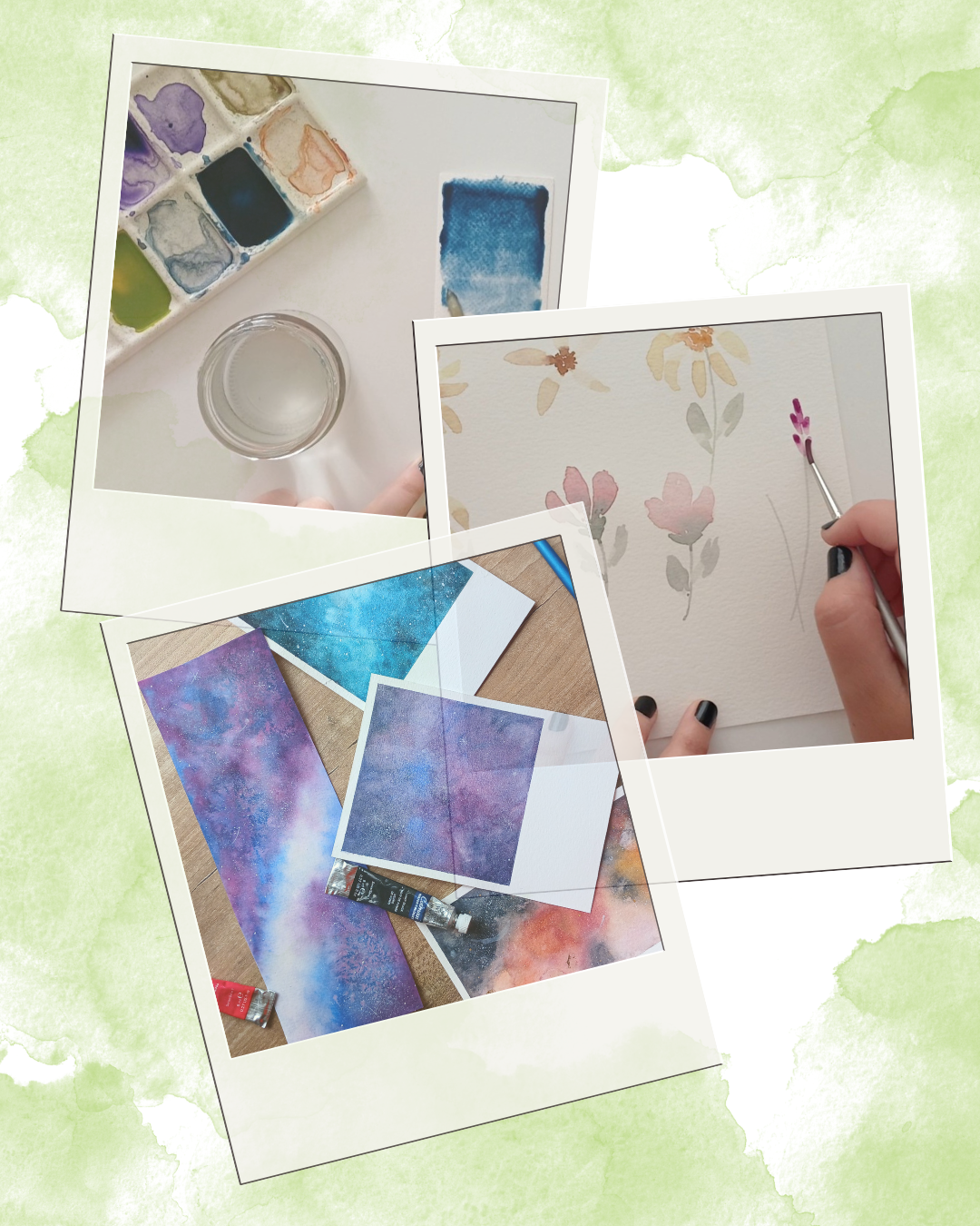 Con un set básico de acuarelas, un par de pinceles redondos, papel de 250gr / 300gr y agua, ya podés empezar sin problema.